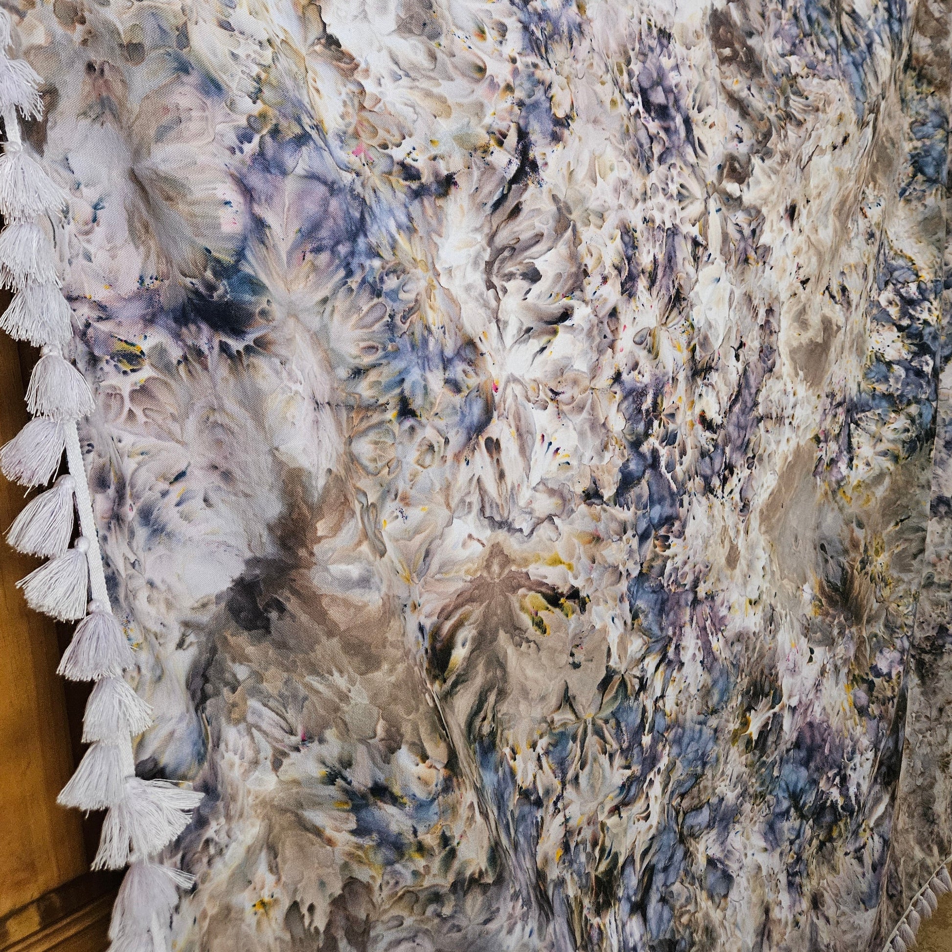 Cotton canvas shower curtain with tassels along 3 edges. Ice dyed with fiber reactive dyes. Unique blend of blues and purples with splashes of yellow and browns.